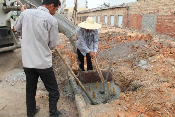 地基預(yù)埋件放在地基澆筑坑正中(注意保持預(yù)埋件、地基與原地面在同一水平面上或螺桿頂端與原地面在同一水平面上,有一邊要與道路平行;這樣方可保證燈桿豎立后端正不偏斜),然后將PVC管的一端放置在蓄電池箱放置處,另一端從地基澆筑坑中基礎(chǔ)件上端固定板正中穿出約30cm。最后以C20混凝土澆筑密實(shí)。在澆筑時(shí)最好用震動(dòng)泵震動(dòng),使混凝土更加均勻、牢固,最后磨平整個(gè)水泥表面。